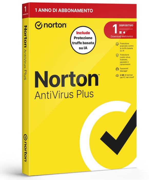 Norton Antivirus Plus 2026 con funzione Antitruffa licenza per 1 Dispositivo durata 12 Mesi spazio cloud 2GB versione Box