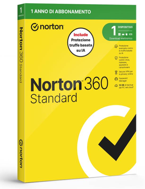 Norton Antivirus 360 Standard 2026 con funzione Antitruffa licenza per 1 Dispositivo durata 12 Mesi spazio cloud 10GB versione Box