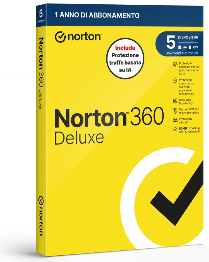Norton Antivirus 360 DeLuxe 2026 con funzione Antitruffa licenza per 5 Dispositivi durata 12 Mesi spazio cloud 50GB versione Box
