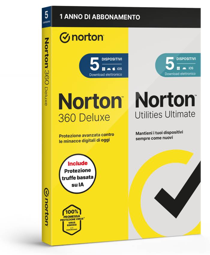 Norton Antivirus 360 DeLuxe 2026 con funzione Antitruffa licenza per 5 Dispositivi durata 12 Mesi spazio cloud 50GB con Utilities Ultimate versione Box