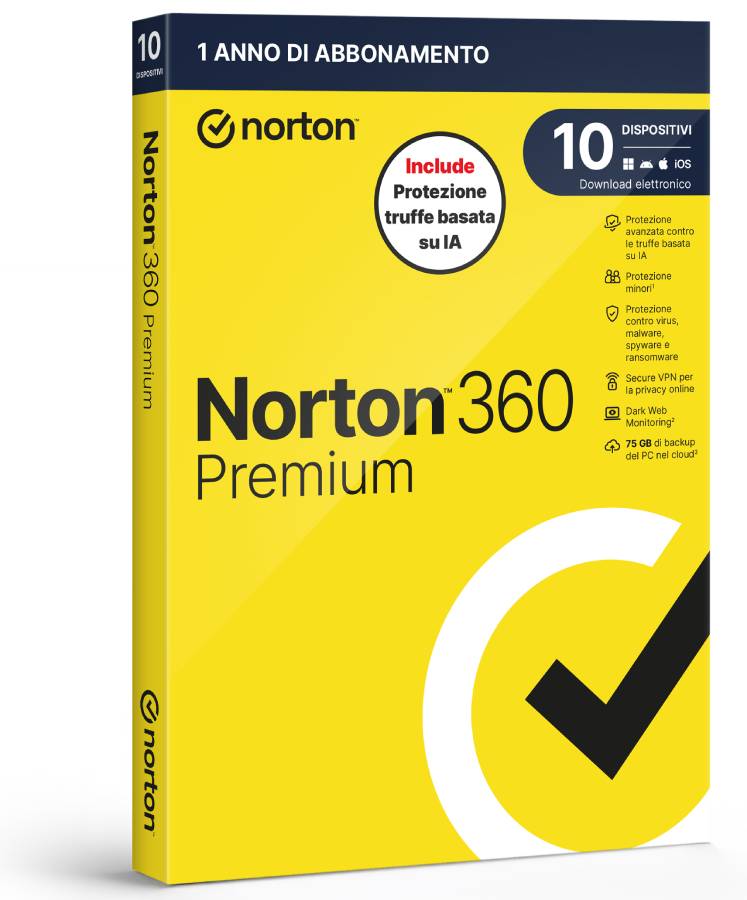 Norton Antivirus 360 Premium 2026 con funzione Antitruffa licenza per 10 Dispositivi durata 12 Mesi spazio cloud 75GB versione Box