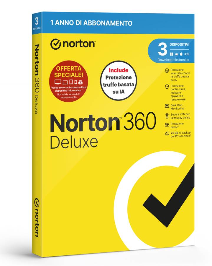 Norton Antivirus 360 DeLuxe 2026 con funzione Antitruffa licenza per 3 Dispositivi durata 12 Mesi spazio cloud 25GB versione Box