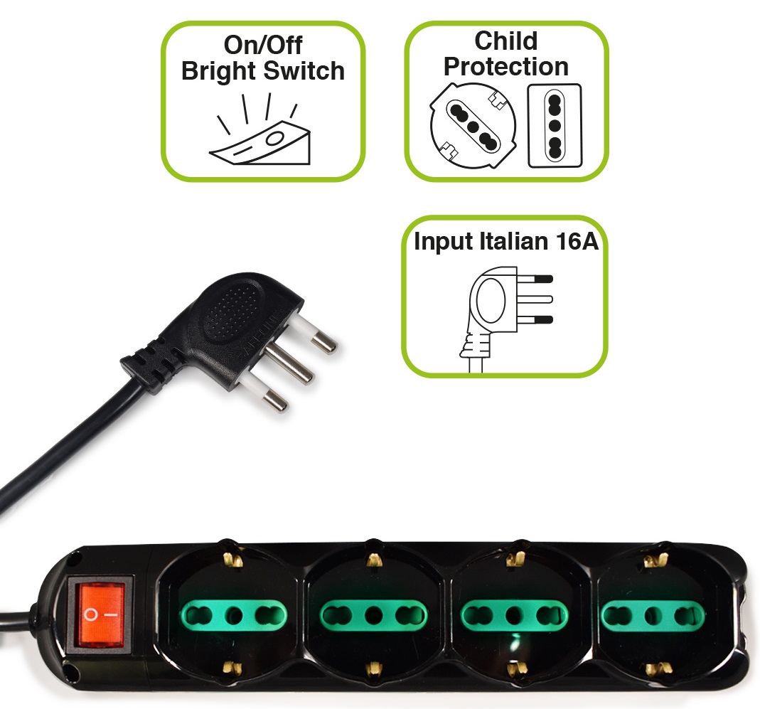 Multipresa Tecnoware con 4 prese Schuko/Ita e 8 prese Italia 10/16A 1xUsb-A e 1xUsb-C con Power Delivery e QC3.0 spina a muro Ita con interruttore On/Off colore Nero