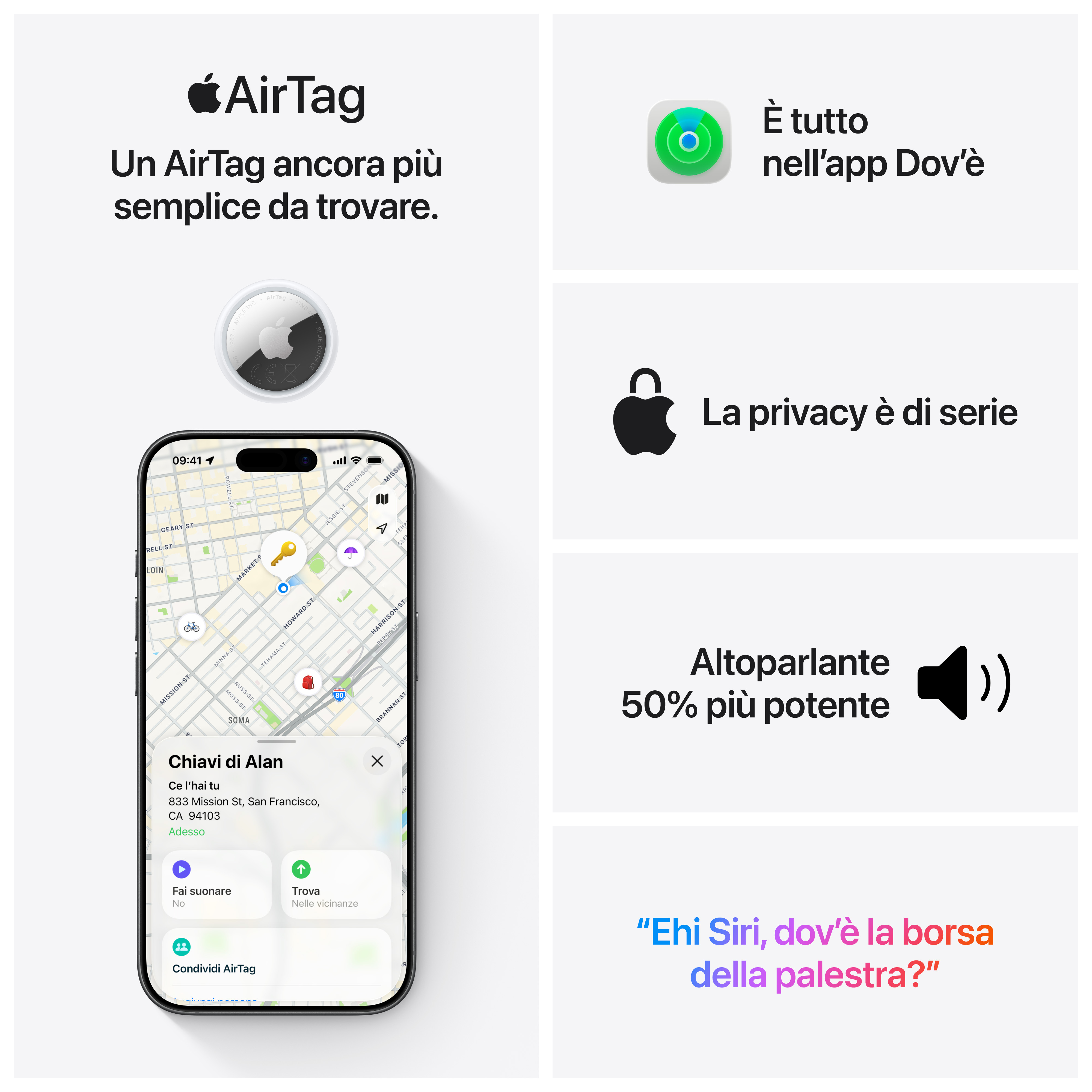 Un AirTag ancora più semplice da trovare. AirTag (seconda generazione) ora ha un altoparlante ancora più potente e un raggio d’azione più ampio per la funzione “Posizione precisa”: [1] così trovare i tuoi oggetti è più semplice che mai.