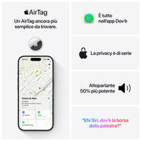 Caratteristiche principali • TROVA LE TUE COSE CON L’APP DOV’È – AirTag (seconda generazione) ti aiuta a non perdere quello a cui tieni di più. Aggancialo a un oggetto per ritrovarlo più facilmente con l’app Dov’è. • FUNZIONE “POSIZIONE PRECISA” MIGLIORATA SU IPHONE E APPLE WATCH – Ti fa trovare l’oggetto che hai smarrito con indicazioni dettagliate su iPhone e ora anche su Apple Watch.[1] • ALTOPARLANTE PIÙ POTENTE – Grazie al volume aumentato del 50% e a un nuovo suono riconoscibile, sentire l’AirTag e ritrovare le tue cose è ancora più facile.[1] • RAGGIO PIÙ AMPIO — Grazie a chip Ultra Wideband e Bluetooth evoluti, puoi trovare i tuoi oggetti da ancora più lontano.[1] • POSIZIONE CONDIVISA — Se perdi qualcosa di importante, puoi condividere temporaneamente la posizione dell’AirTag in tutta sicurezza con contatti di fiducia, terze parti o più di 50 compagnie aeree partner. • AUTONOMIA — AirTag (seconda generazione) è progettato per funzionare oltre un anno con una normale batteria, che puoi sostituire facilmente: sarà il tuo iPhone a dirti quando è il momento di cambiarla.[2] • LONTANO DA OCCHI INDISCRETI – La posizione del tuo AirTag è visibile soltanto a te e alle persone autorizzate. I dati sulla posizione e la cronologia non vengono mai memorizzati sull’AirTag. • DESIGN PIÙ SOSTENIBILE – Il nuovo AirTag impiega l’85% di plastica riciclata per il guscio e ha una confezione composta al 100% da fibre.[3]