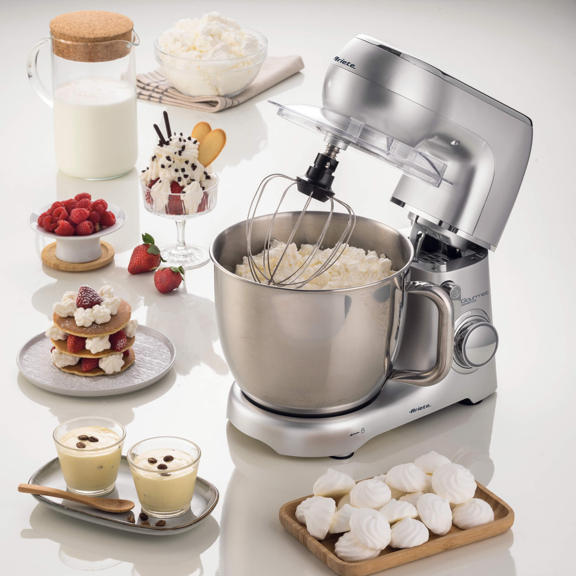 Gourmet essence è l’impastatrice planetaria che facilita e velocizza ogni tipo di preparazione. Impasta, amalgama e monta gli ingredienti perfettamente. Ideale per chi ama sperimentare nuovi piatti in cucina. Grazie ai suoi 1300W di potenza e alla capacità di 5,2L della ciotola in acciaio inox con maniglia, permette di lavorare una grande quantità di impasto con i diversi accessori a disposizione: con la frusta a fili puoi montare gli ingredienti per i dolci, col gancio puoi lavorare gli impasti più duri e con la frusta a foglia puoi amalgamare gli ingredienti per gli impasti morbidi. Puoi inserire gli ingredienti direttamente nella pratica apertura del coperchio anche mentre Gourmet Essence è in funzione e regolare la lavorazione con le 10 velocità + Pulse. Con Gourmet Essence puoi lavorare ogni impasto grazie alle sue dimensioni adattabili ad ogni cucina.Tu metti gli ingredienti, al resto pensa Gourmet Essence!