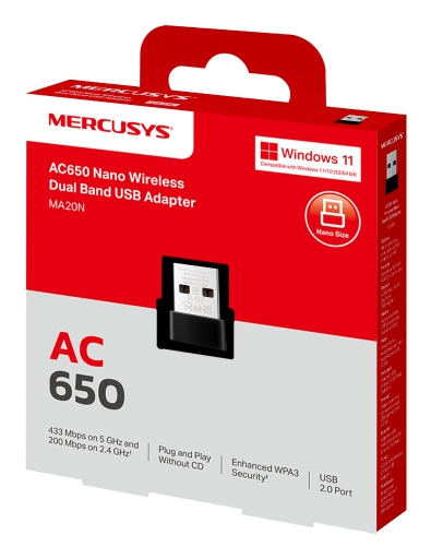 Mercusys MA20N. Tecnologia di connessione: Wireless, Interfaccia host: USB tipo A, Interfaccia: WLAN. Velocità massima di trasferimento dati: 650 Mbit/s, Wi-Fi standard: Wi-Fi 5 (802.11ac), Banda Wi-Fi: Dual-band (2.4 GHz/5 GHz). Colore del prodotto: Nero, Metallico