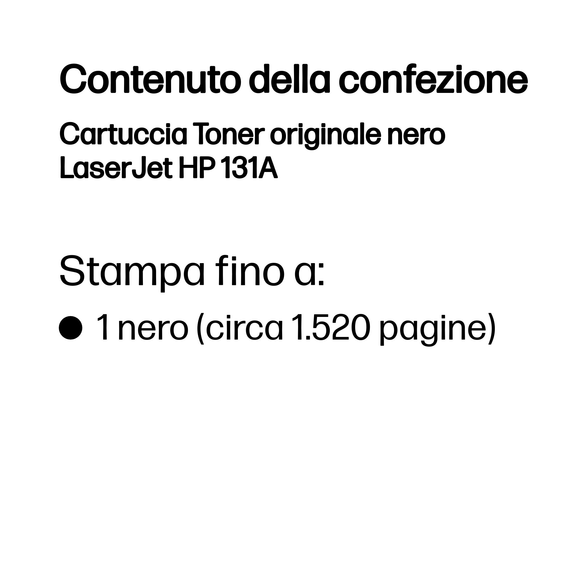 La cartuccia di stampa HP 131A LaserJet nero consente di stampare documenti e materiale di marketing di qualità professionale in casa o in ufficio. Mantenete elevata la vostra produttività evitando sprechi di tempo e materiali di consumo. Queste cartucce sono sviluppate appositamente per la vostra stampante.