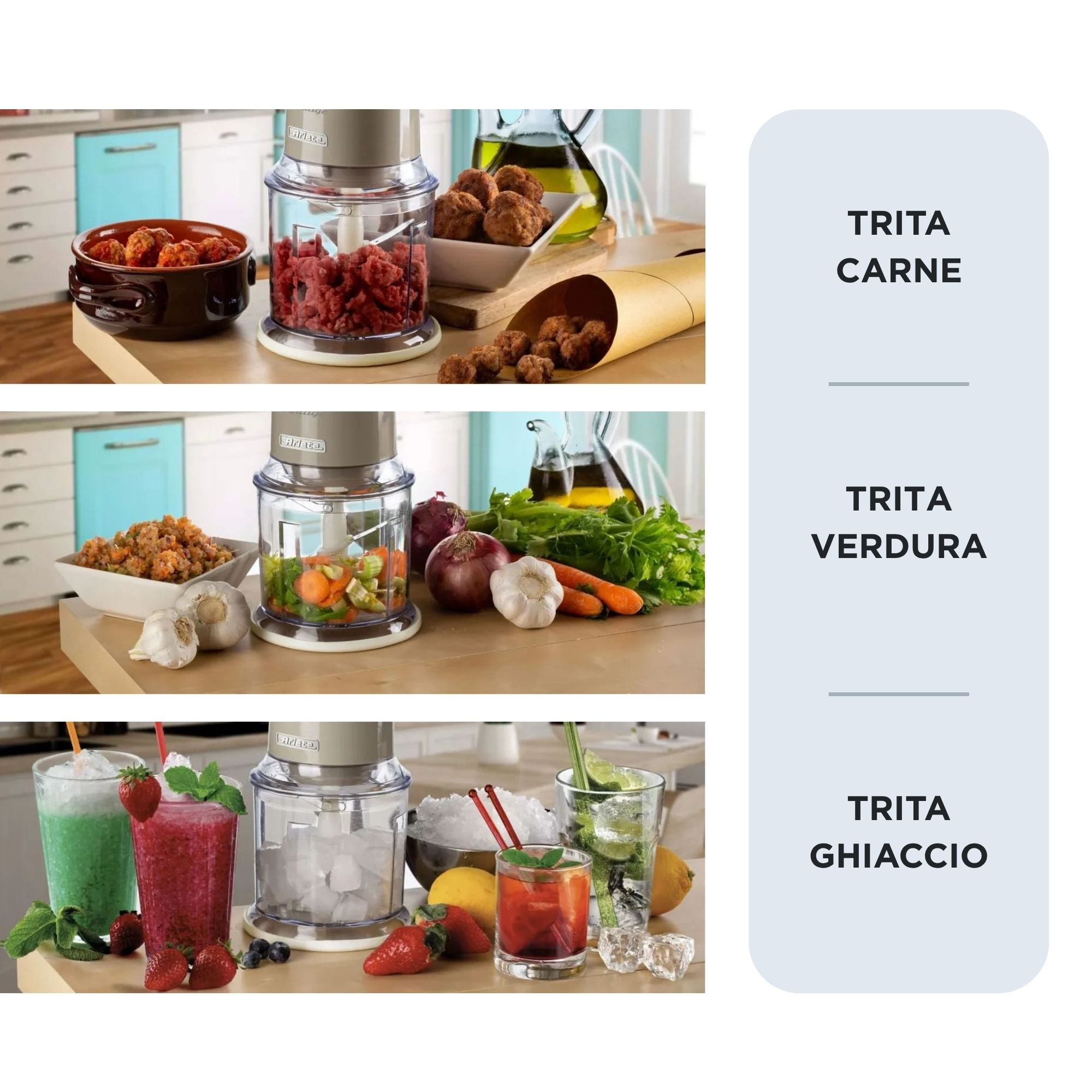 La Linea Vintage di Ariete si arricchisce di un prodotto indispensabile per le tue ricette in cucina: un tritatutto elettrico dalle linee retrò e dai tenui colori pastello, perfetto per portare un tocco di stile e funzionalità nella tua cucina. Grazie alla sua potenza di 400 Watt e alle 4 lame in Acciaio Inox, il Chopper Vintage ti consente di tritare qualsiasi ingrediente per le tue ricette: dalle verdure alla carne, formaggio, pane, frutta secca e perfino al ghiaccio. Le 2 velocità, azionabili con i due pulsanti posti sulla sommità del Tritatutto, ti permettono di sminuzzare o tritare finemente gli alimenti, mentre I piedini antiscivolo ti assicurano la massima adesione del prodotto al piano di lavoro.