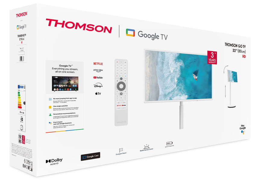Thomson 32HG4M45 – Smart TV 32" HD Google TV Portatile, Wi-Fi, Dolby Audio, 200 cd/m², Bianco La Thomson 32HG4M45 è una Smart TV HD da 32 pollici progettata per offrire intrattenimento flessibile e moderno. Grazie al sistema operativo Google TV, permette l’accesso a migliaia di applicazioni e servizi di streaming come Netflix, Prime Video, YouTube, Disney+ e molti altri, organizzati in un’interfaccia intuitiva e personalizzata.