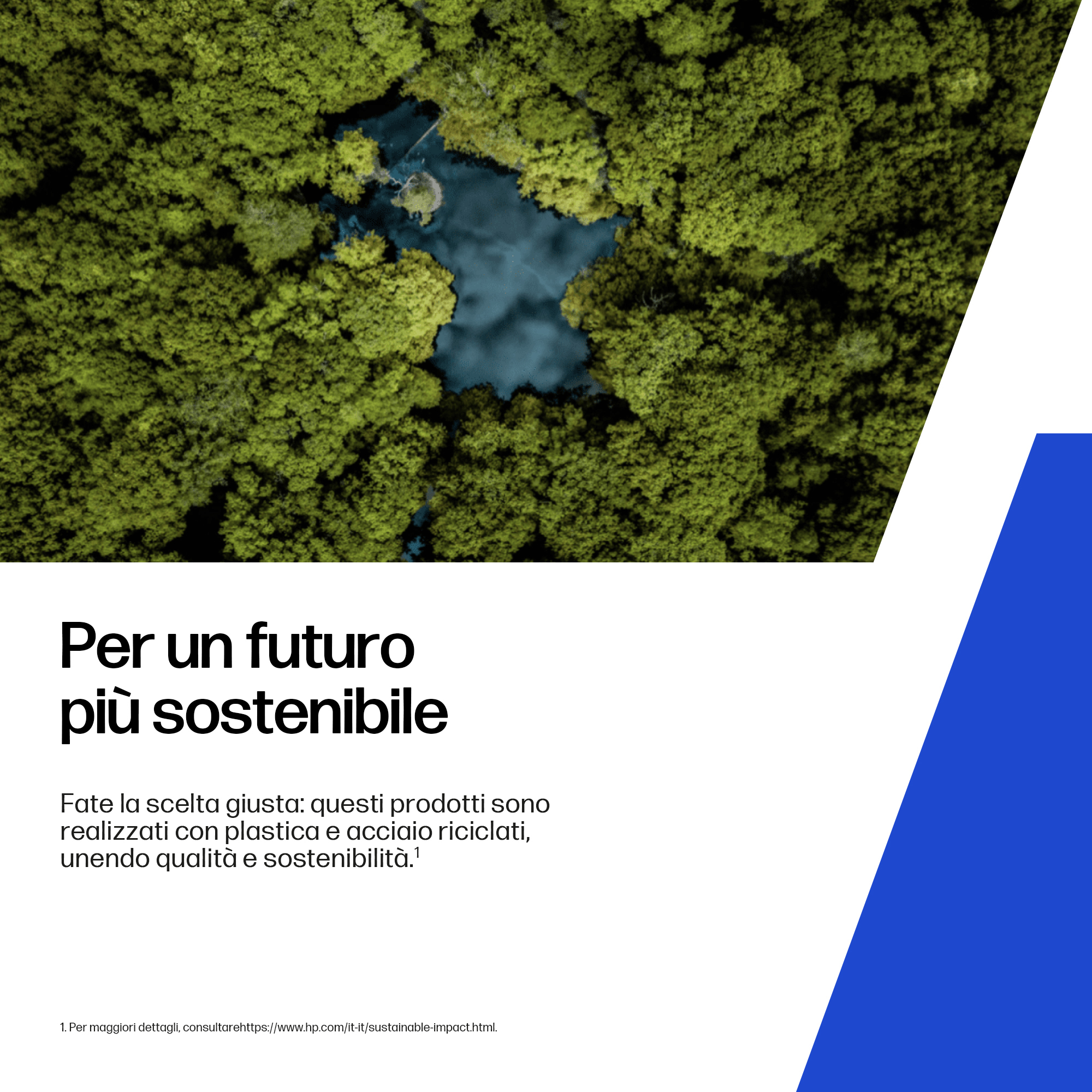 Bassa concentrazione di alogeni; Disponibilità di imballaggio sfuso; 10% di plastica a ciclo chiuso ricavata da apparecchiature informatiche; 25% di plastica potenzialmente destinata agli oceani nelle ventole del sistema; Impronta di carbonio del prodotto; Contiene almeno l'65% di plastica riciclata post-consumo; Il sistema è dotato di un'esperienza abilitata per codice QR in cui l'utente ha accesso a un portale dedicato ai prodotti. Qui, a partire da dicembre 2025, sarà possibile visualizzare le caratteristiche del prodotto, informazioni sulla sostenibilità, guide introduttive e servizi diretti di configurazione e supporto; È disponibile per i clienti una nuova dashboard sul consumo energetico che fornisce indicazioni puntuali sulle emissioni carboniche, nonché azioni consigliate per ridurre la propria impronta carbonica